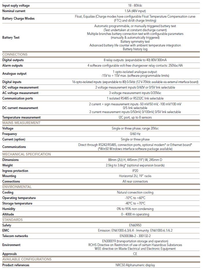 The NRC50 is a flexible and powerful microprocessor controlled monitoring and control system, capable of controlling up to 120 digital or up to 64 analogue rectifiers. The NRC50 can report up to 200 pre-defined alarms. As well as advanced battery management, the NRC50 can report system alarms via standard communications protocols and has a LCD display for full system interrogation.