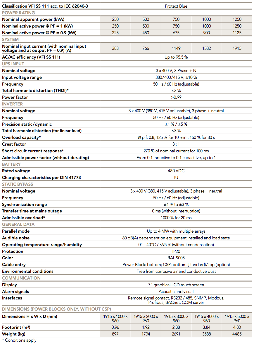 Power Blue offers a highly efficient & reliable UPS solution for large data centers and IT applications in power ranges up to 4MW. In times of constantly increasing energy prices, Power Blue helps reduce the costs for operation and cooling to a great extent through high efficiency. Power Blue is based on a 250kW power block architecture that can be configured with parallel operation to meet high power requirements (up to 4000kW); n+1 redundancy operation is also possible. All “Power Blocks” are equipped with decentralized control mechanisms to increase operational safety. Power Blue is transformer-less, works with the latest 3 level IGBT technology and therefore typically reaches an efficiency level of up to 95.5% (in double conversion, VFI). Power Blue combines all the advantages of this technology, such as low input THDi <3%, high input power factor >0.99 and output power factor up to 1.