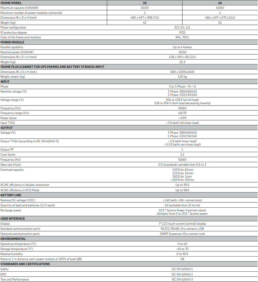 Power Plus M400 combines a high operating efficiency value, with a compact footprint and modular architecture. The 20 and 40 kVA frames can be used as stand-alone units (on casters) or installed inside a 19" rack cabinet or in a Frame Plus UPS and battery cabinet.