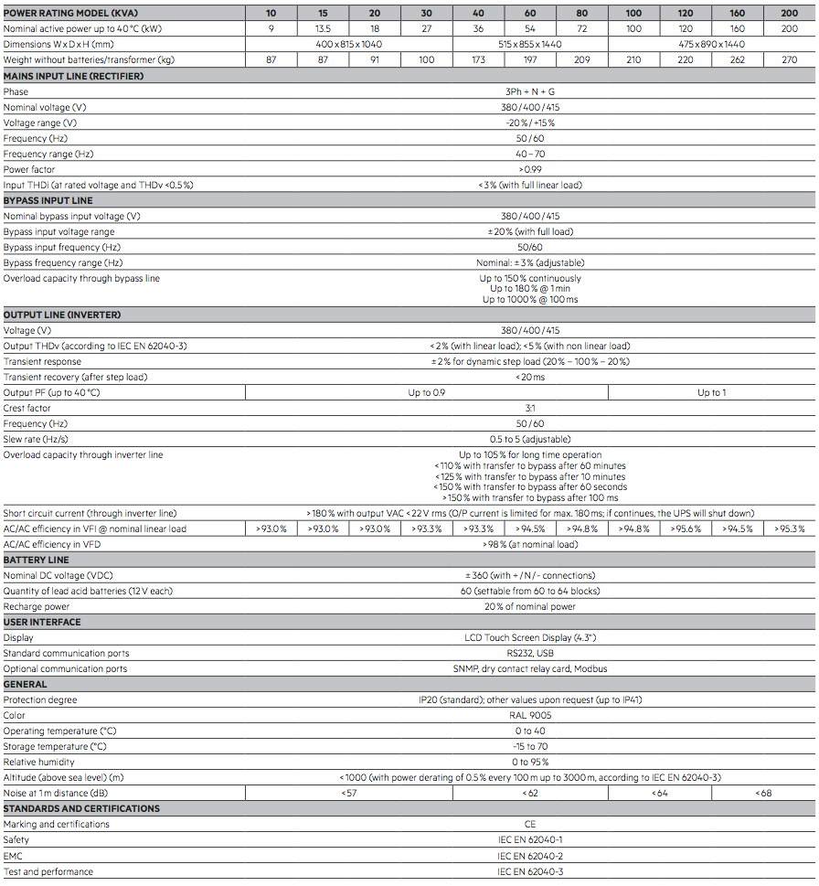 The combination of high-level performance, with integrated battery solutions, or inbuilt galvanic isolation, the compact footprint and the wide range of options, make Power Plus S300 the best solution for the power quality of any critical load. TSE UPS is based on a highly efficient transformer-less double conversion technology, ensuring the lowest OPEX on the market in its category. Best in class for energy consumption; the system has a very low Total Cost of Ownership.