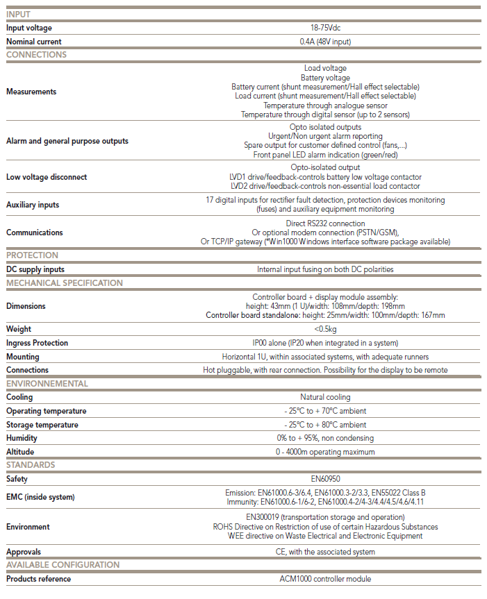 Flexible, hot pluggable, alarm and control module for monitoring and control of stand-alone power systems for up to 31 rectifiers. Easy local parameters configuration capability (automatic discharge test, capacity meter, presence test, low voltage disconnect etc). Advanced battery management. PC monitoring software. Optional TCP/IP boards