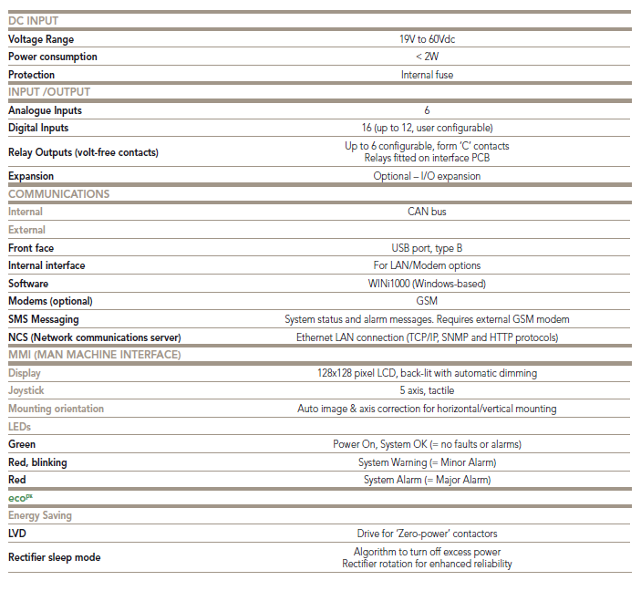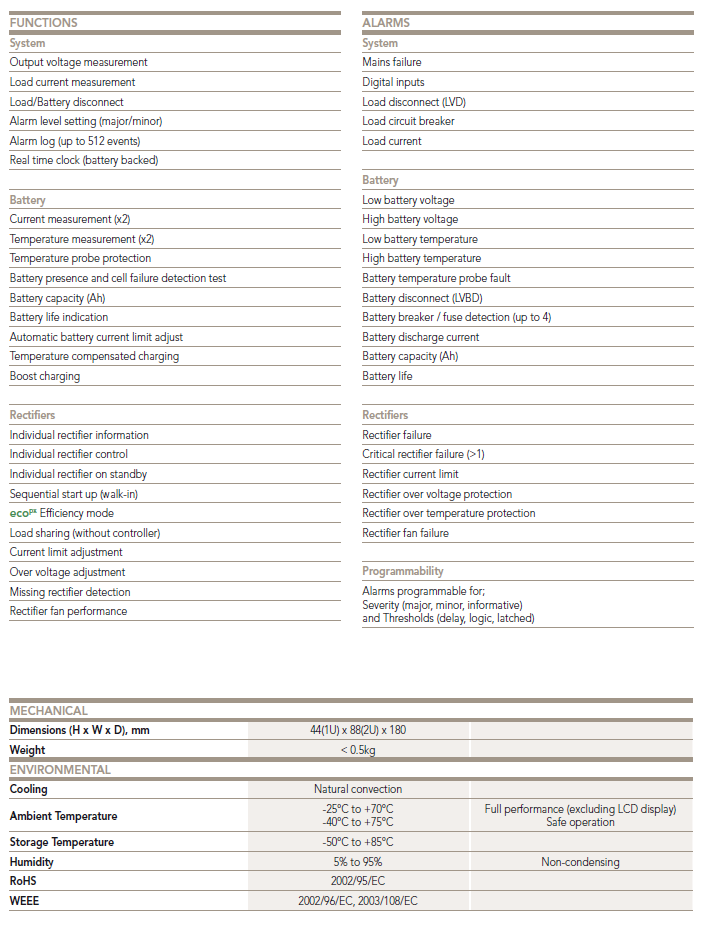 Powerful, flexible, hot pluggable, alarm and control module for monitoring and control of stand-alone power systems for control of all the rectifiers. Local parameters configuration capability (automatic discharge test, capacity meter, presence test, low voltage disconnect etc). Advanced battery management. Dedicated PC software. Optional TCP/IP boards. ECOpx for hybrid solutions.