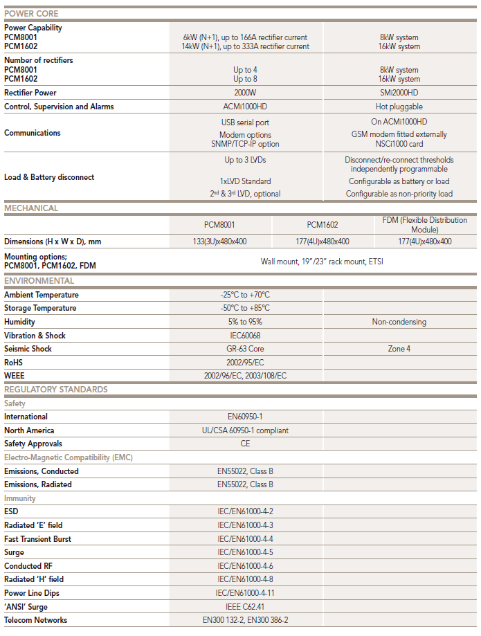Core modules for use in power system designed specifically for the Telecom and Datacom industries. The PCM8001 and PCM1602 are 8kW and 16kW core modules that have all the basic elements of a DC power system. With the addition of AC and DC distribution and rectifier shelves any flexible arrangement of DC power system design can be catered for.