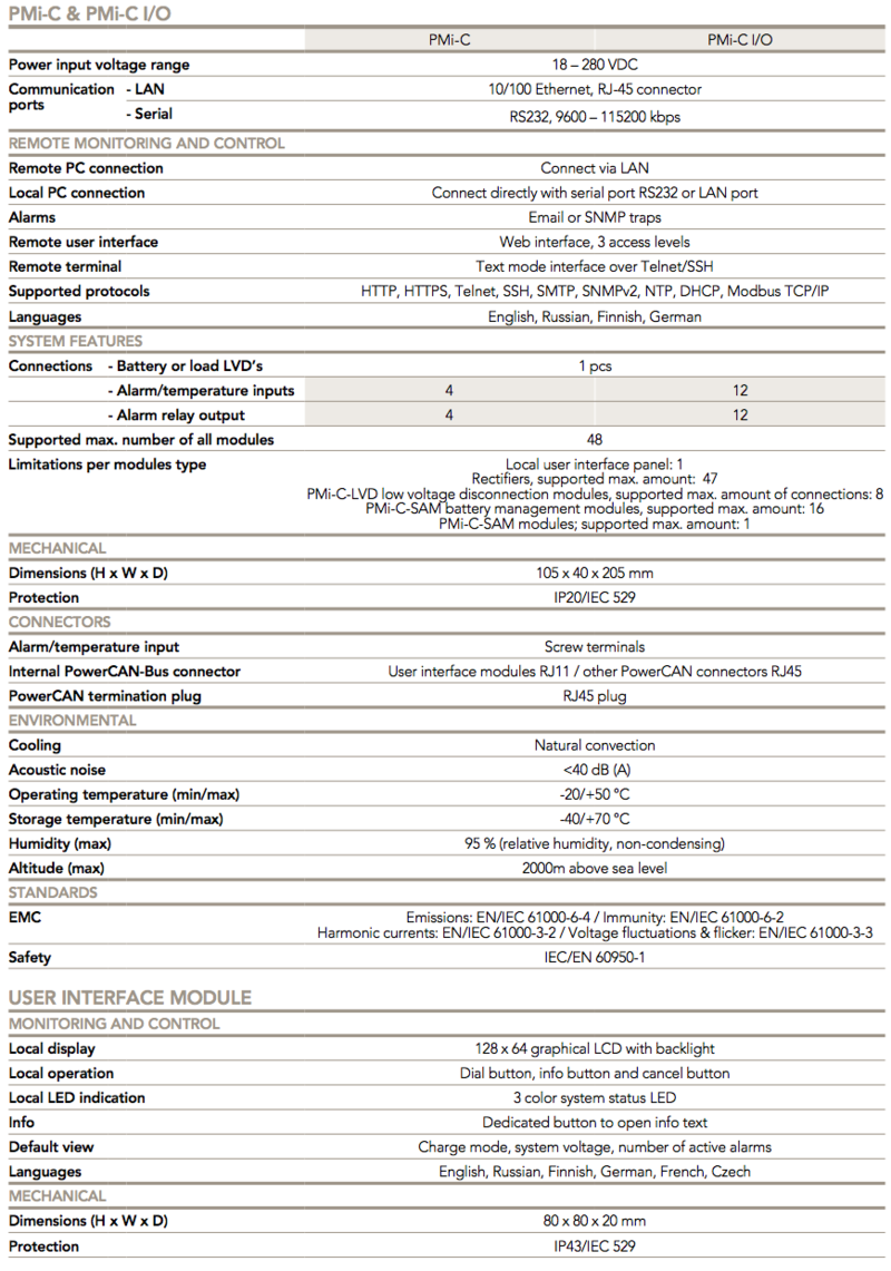PMi-C is the advanced monitoring and control device for PMi DC Power Systems. It delivers intelligence, an easy user interface and a comprehensive set of features for DC Power System management. PMi-C architecture is based on PowerCAN bus communication and a modular design, which enables excellent system expandability, selectable additional features and flexibility in design. The PMi-C controller is the universal solution for all SMP family DC Power Systems from 24 VDC up to 220 VDC, and for other modules in the family.