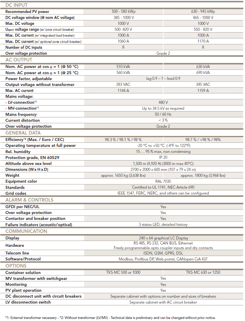 With an efficiency factor over 98%, the Power PV.500-UL and PV.630-UL well exceed expectations for their power class. With an appropriate transformer, it can also be adapted to the low voltage grid (LV 480 VAC) or medium voltage grid (e.g. 12.47, 34.5 kV).
