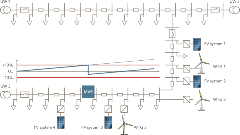 The increasing volume of regenerative power fed from photovoltaic systems, wind farms and biogas plants cause enormous voltage fluctuations, particularly in rural medium voltage networks supplied over long distances and low loads. Extending the supply network with additional underground or overhead power lines is extremely costly, and requires extensive planning and approval procedures. Faster, easier, and significantly less costly is a implementation of the medium voltage linear regulator powerbox MVR. The patented VSC technology reduces harmonic current emission. powerbox MVR is suitable for capacitive and inductive load flow. It is a turnkey solution with integrated medium voltage switchgear, and its compact design fits into a 30 foot ISO container. powerbox MVR works completely independently, requiring no external intervention; intervention is, however, optionally available via a communication connection to a control centre.