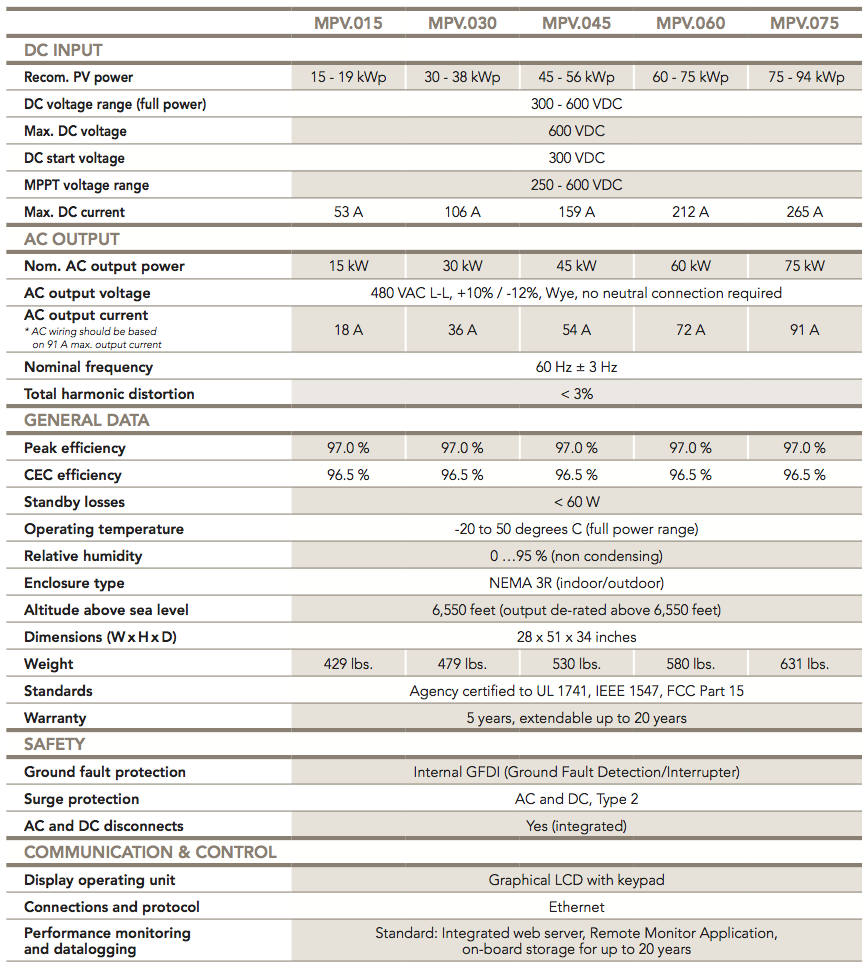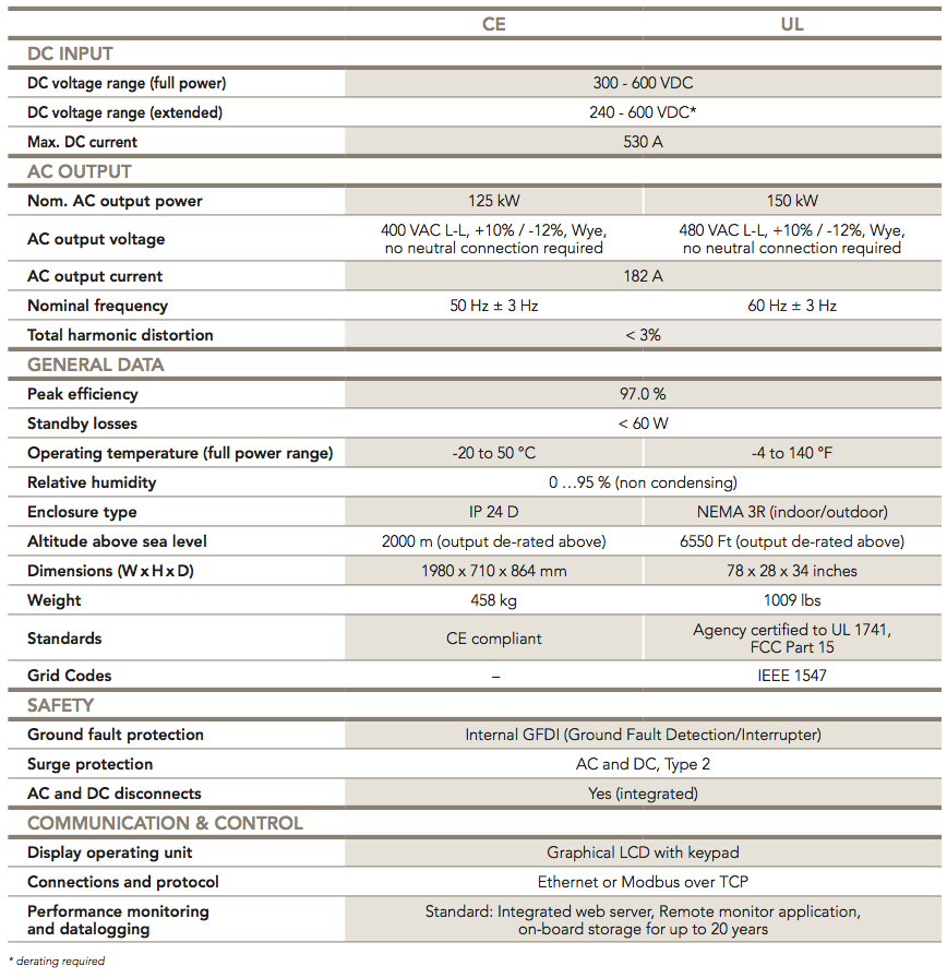 ADVANCED CONTROL & COMMUNICATIONS The Maximum Power Point Tracking is designed to meet the latest requirements for fast response to dynamic changes in clear and cloudy conditions, plus provide reliable active/sleep detection for day and night shift. Monitoring and power plant integration is based on CAN BUS communication. Web server and datalogging are integrated into the inverter. Advanced operator controls are supported. |