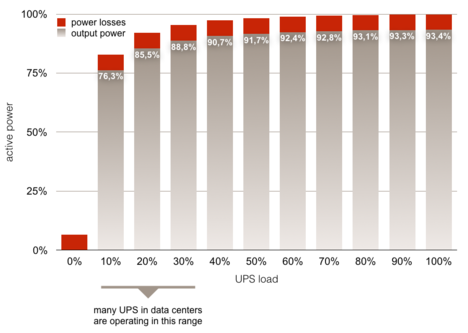 In high-availability date centres certified in line with EN 50600-2-2 for "high" overall availability (availability class 3), which are required to guarantee an availability of 99.995%, other reliability aspects must be taken into consideration: UPS systems themselves are not immune to technical failures, and must be redundant in design. In classic UPS architecture, two redundant systems must be installed so that the second system can replace the first in the event of a failure. As a result, each of the systems can be operated at a maximum of just 50% load. For EN 50600-2-2 "very high" classifications (availability class 4), the system is no longer operated at 50% load, but instead at a lower rate, depending on the module size. For this reason, special attention should be paid to suitable module sizes and high partial load efficiency when selecting components for the system.